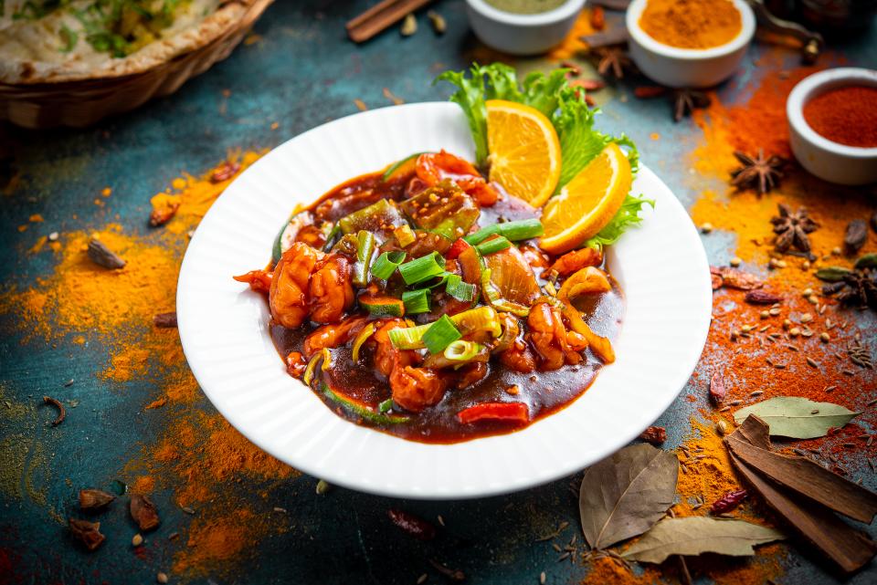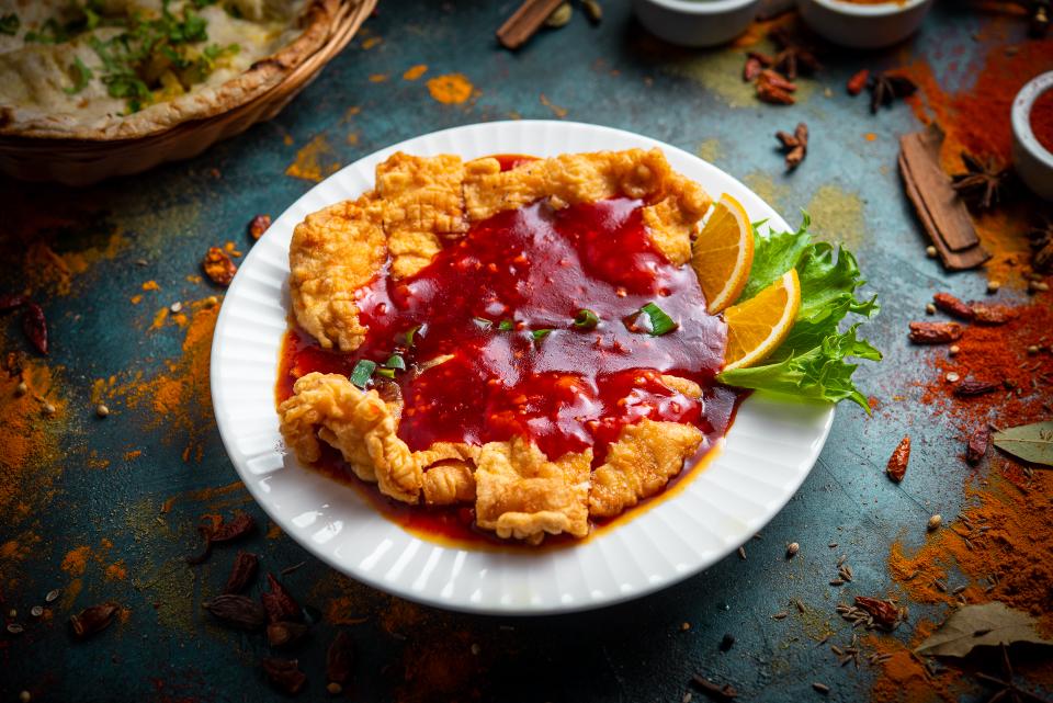Krõbedaks küpsetatud kana, hakklihaga täidetud baklažaan, spetsiaalse peakoka Cheng-du kastmega.